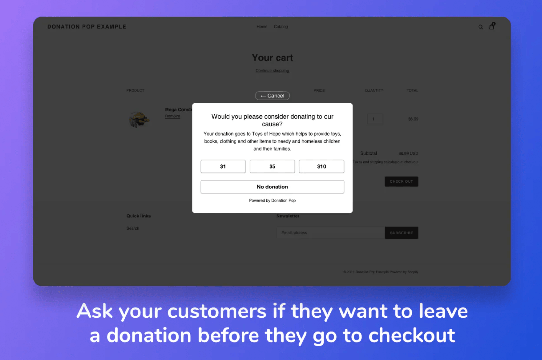 Available on the Shopify App Store, adds donation functionality to stores, installed by 500+ brands. Built with Rails 7, PostgreSQL, Turbolinks, Sidekiq, Redis, Liquid, Shopify Polaris, Shopify CLI & API.